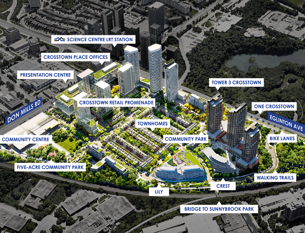 Other planned buildings that have yet to gain approvals include the Lily, a nine- and nine-storey complex in Block 9, 10 three-storey townhouse blocks in Block 8, and the new Don Mills Community Recreation Centre and Park in Block 3B. Once complete, the Crosstown Community project is slated to deliver a whopping 4,921 new housing units in buildings ranging from townhomes to mid- and high-rise towers containing residential, office, commercial, and retail space, as well as new roads, parks, and open spaces.
