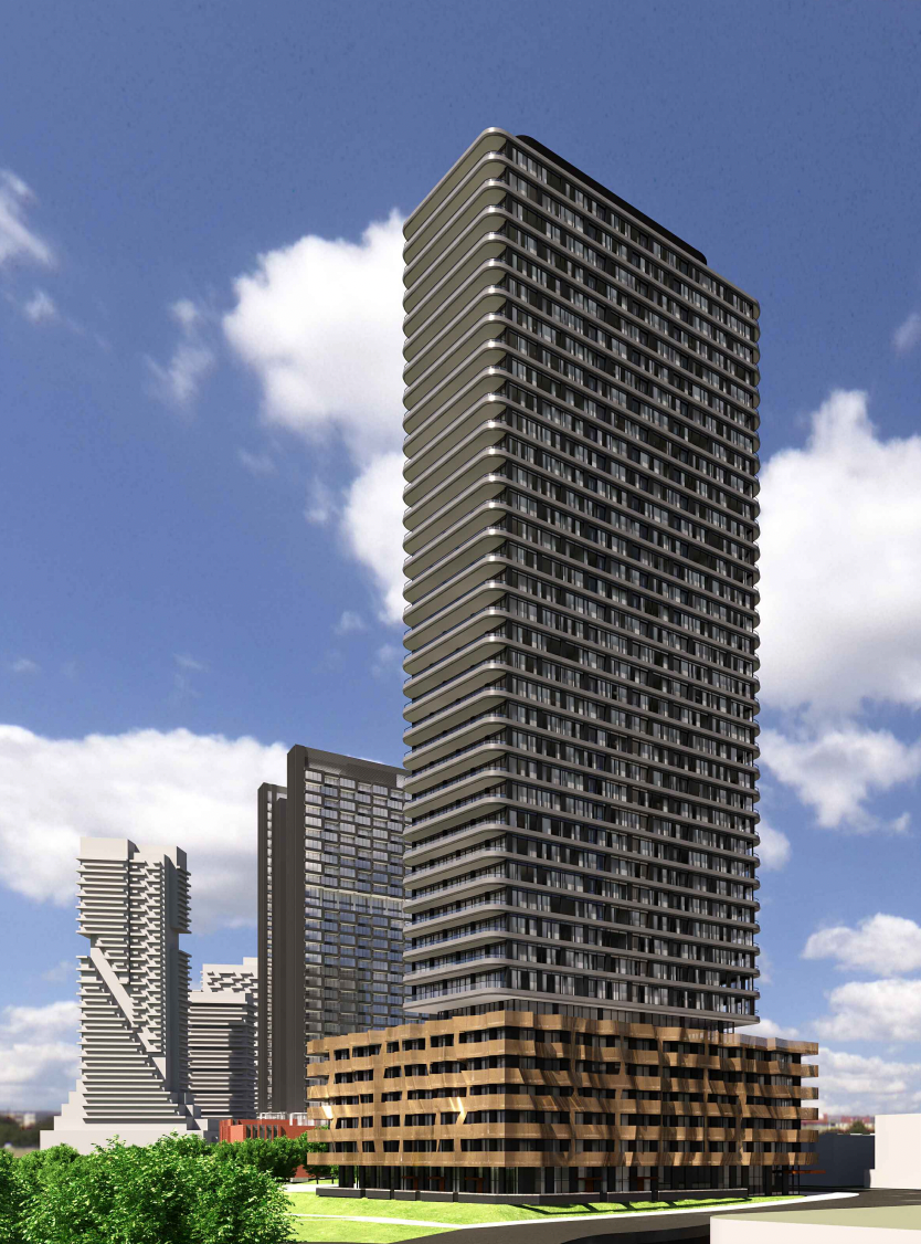 Aspen Ridge has submitted plans for a 39-storey residential tower to advance the master-planned Crosstown Community at Don Mills Road and Eglinton Avenue East. The tower would be located within Block 6C — one of 17 blocks that make up the 60-acre mixed-use, transit-oriented development anchored by the Don Valley Station on the Eglinton Crosstown LRT line, which is slated to open this September.