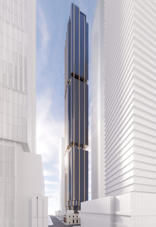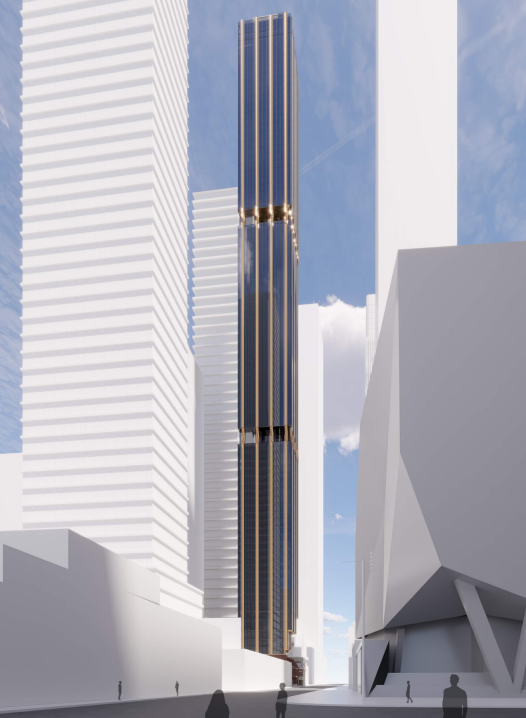 This soaring building at 372-378 Yonge Street would be one of the tallest in the city at 278 m. Under the architect Dialog, the design has been reimagined compared to the original proposal. Where it was once a sleek, curved monolith, the renderings now reveal a more geometric look with three distinct rectangles sat atop each other, connected by gold exoskeleton beams running the entire length of the building.