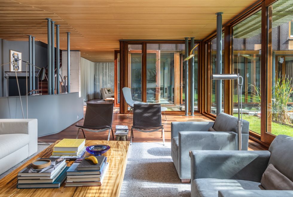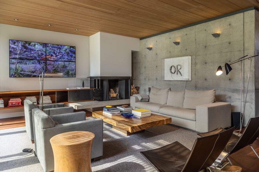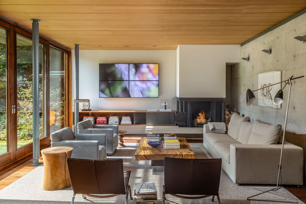 A two-tiered lily pond and serene lap pool anchor the main floor, visible from virtually every angle thanks to expansive and layered sight lines. As natural light pours through, the reflection of water dances across concrete and wood surfaces, giving the interior a feeling of meditative calm.