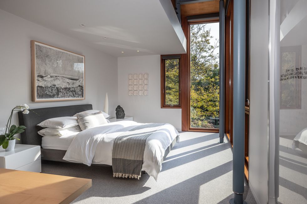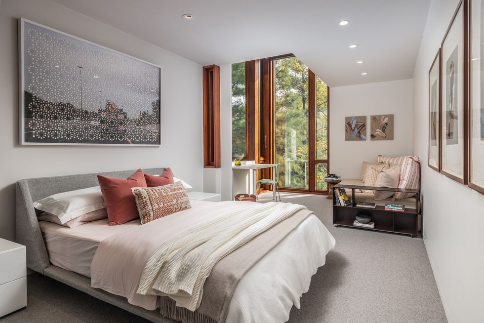 Unsurprisingly, the residence has earned notable acclaim, including a Governor General’s Medal in Architecture in 2004. From the street, its angular steel frame and broad mahogany-framed windows set a quietly confident tone — but it’s the way the home interacts with its surrounding ravine landscape that truly sets it apart.