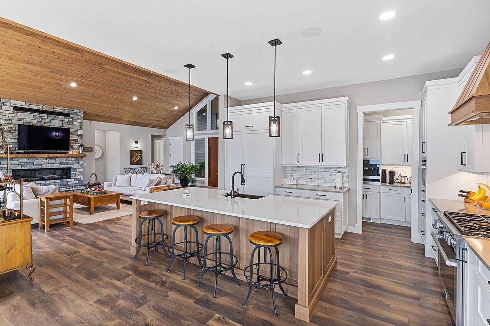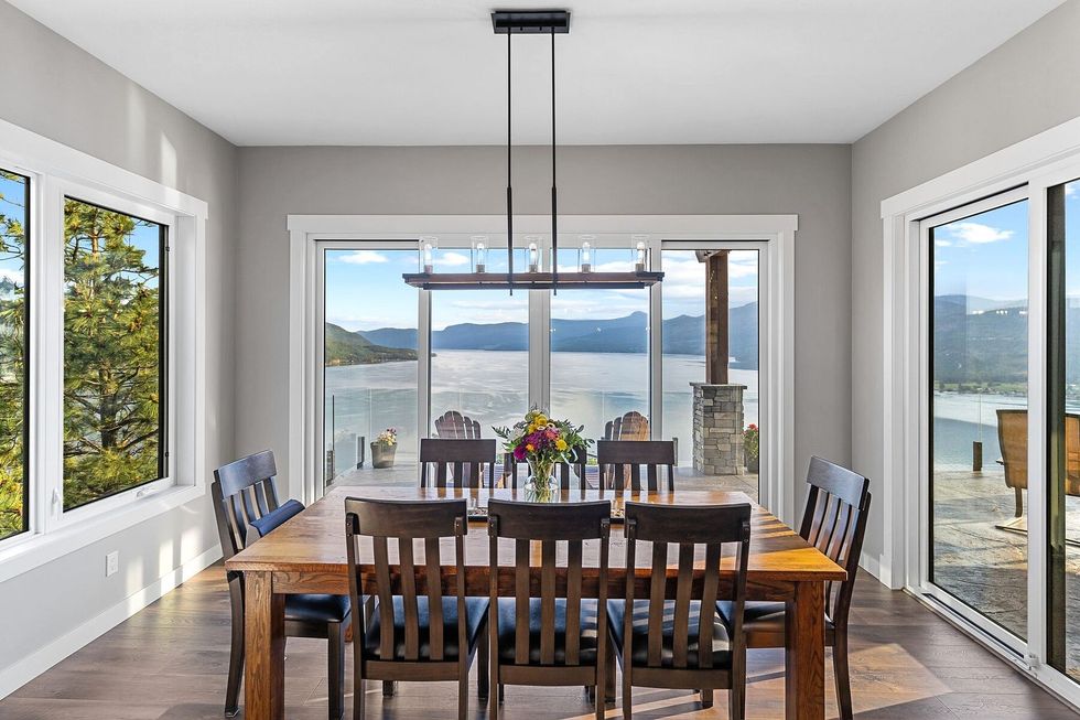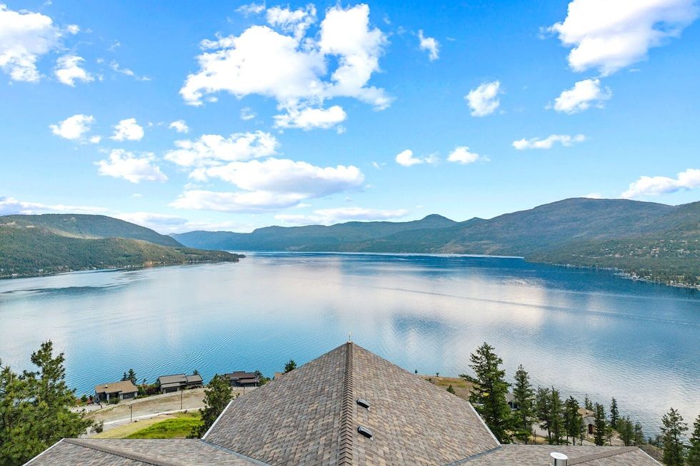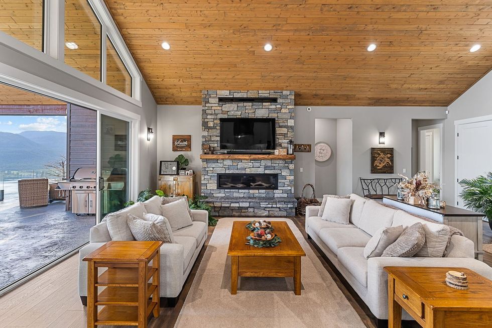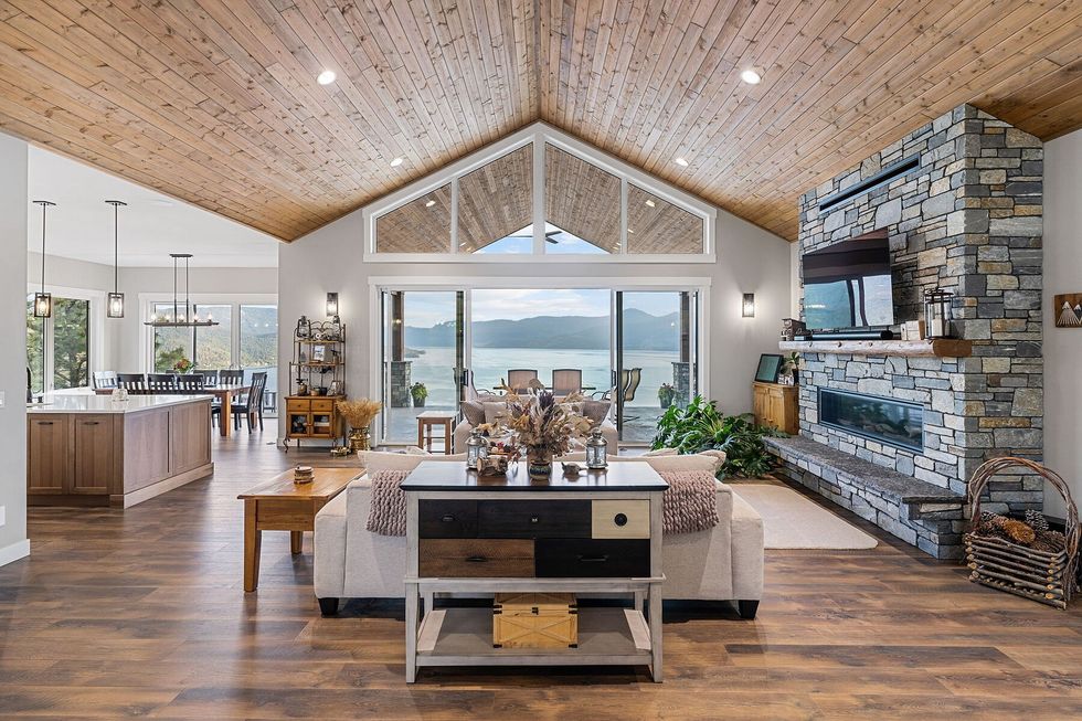 Arrive through the solar-powered gate and you’re met with a contemporary West Coast–inspired home, where soaring ceilings, a dramatic fireplace, and expanses of glass capture 270 degrees of lake and mountain vistas.