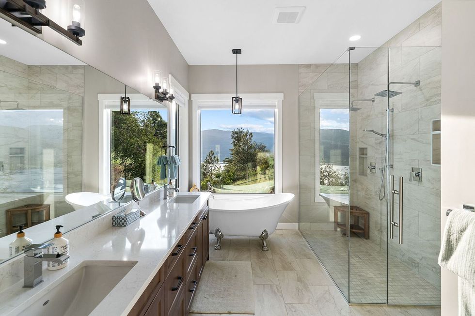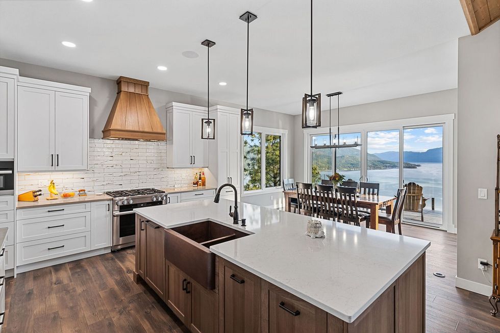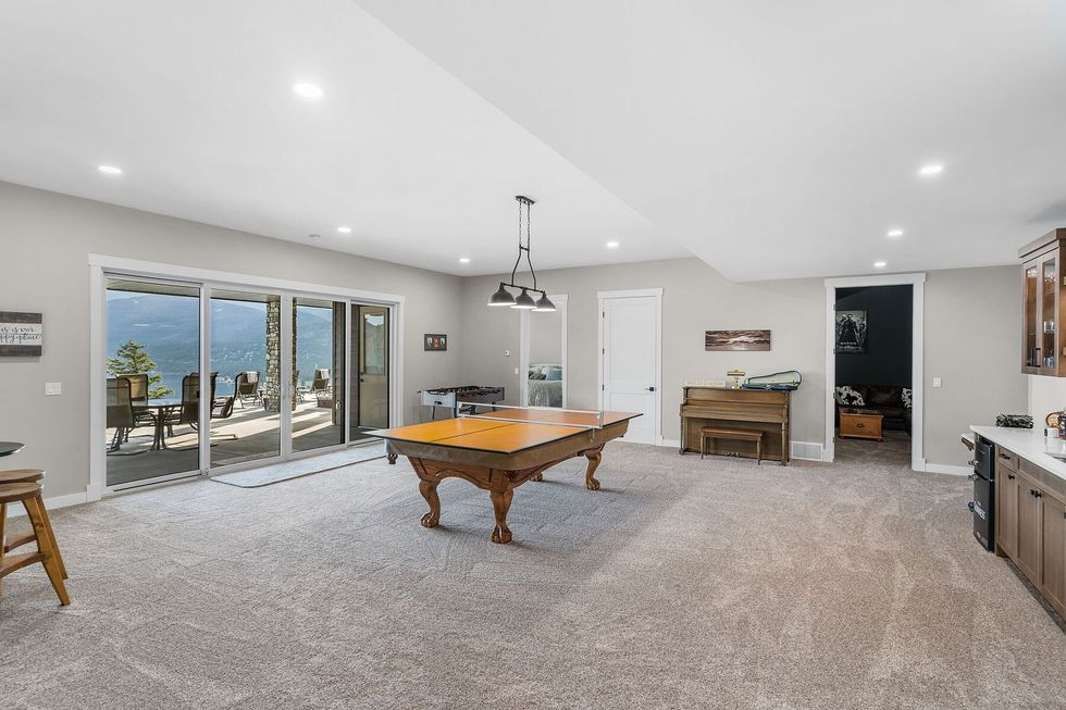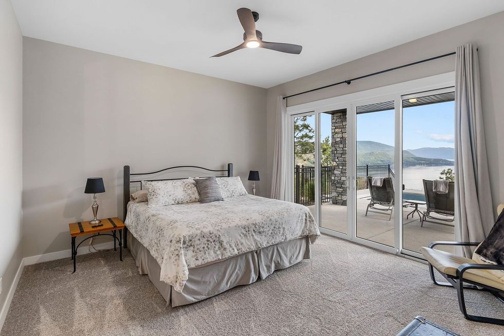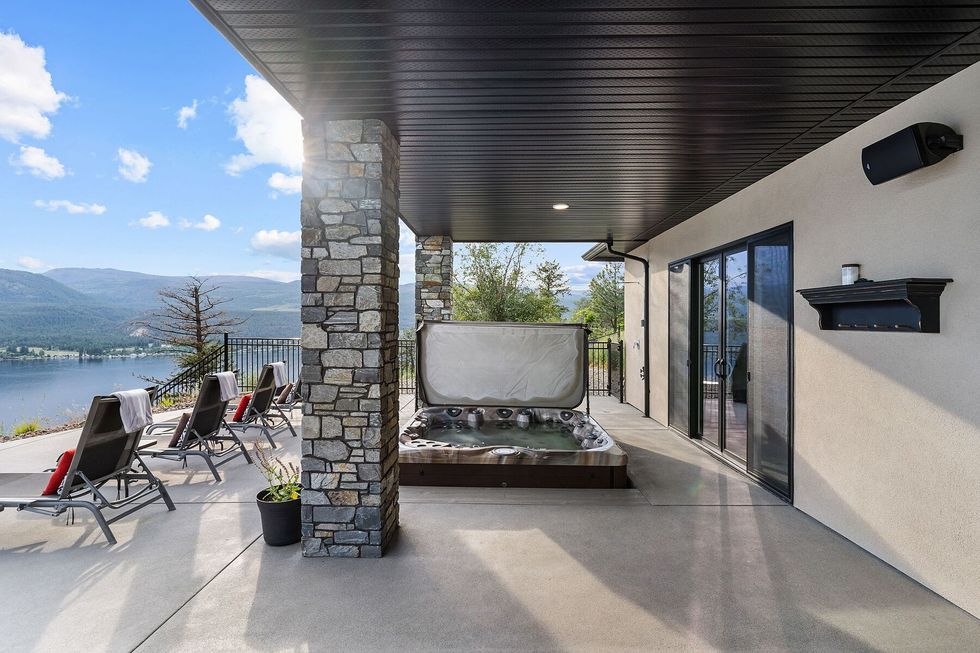 The gourmet kitchen — anchored by Miele appliances, a built-in espresso bar, and a dedicated prep space — flows effortlessly to the dining and living areas, while an 800-plus-sq.-ft covered terrace invites seamless indoor-outdoor living. Frameless glass railings keep sightlines clear, while power shades temper the Okanagan sun.