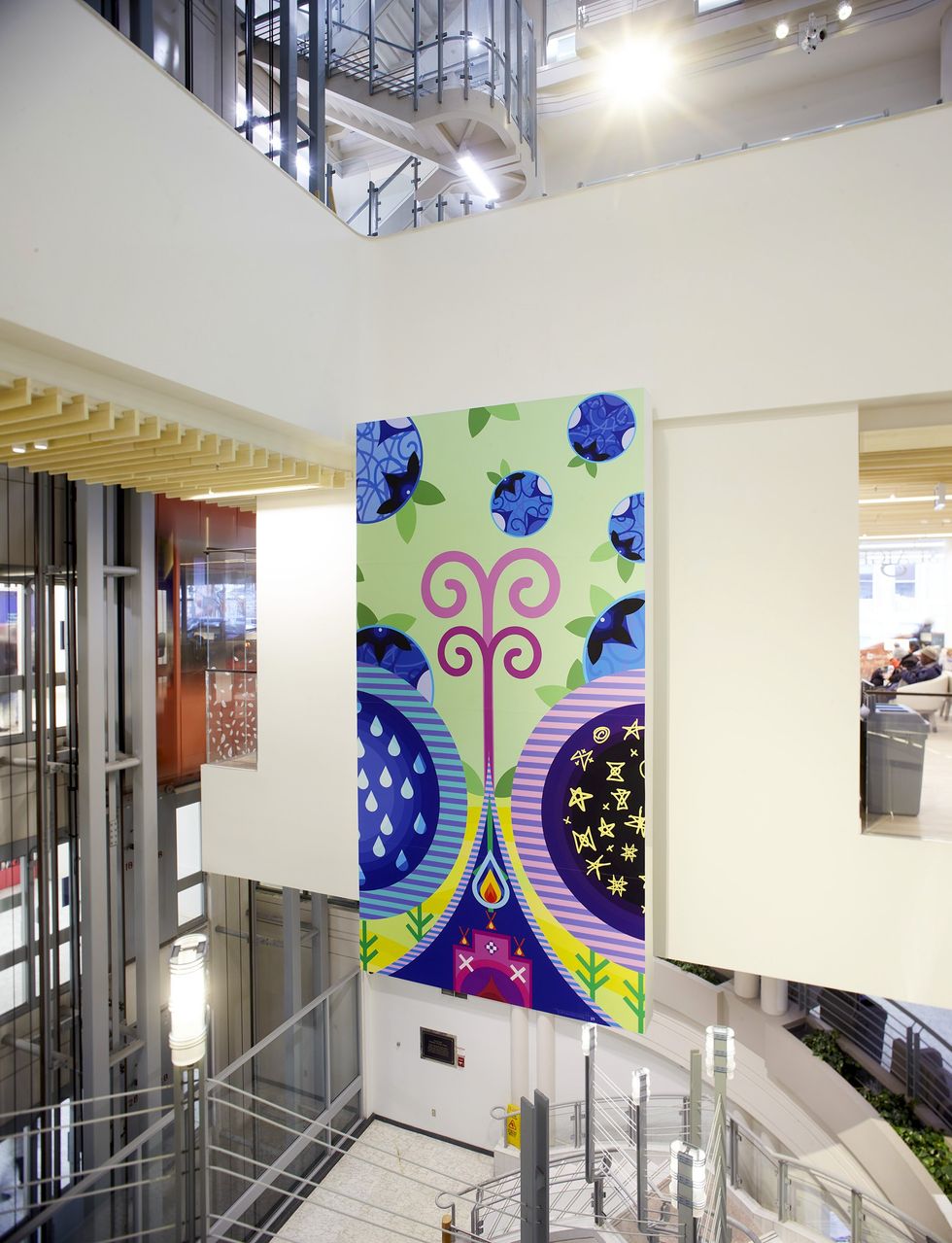 Bennett's vibrant Blueberries with Nan will find its new home at the Princess Margaret Cancer Centre. The large painting "blends cultural symbols with contemporary forms, creating a powerful visual narrative of colour, growth and resilience," says the press release. Bennett explains that blueberries are shared at feasts as a symbolic gesture in Mi'kmaq culture. For him, blueberries represent healing, power and hope, and sharing this art piece symbolizes him charing his medicine.