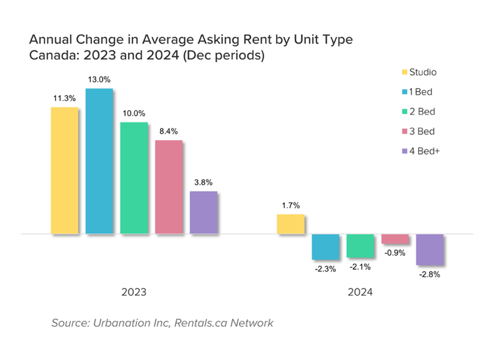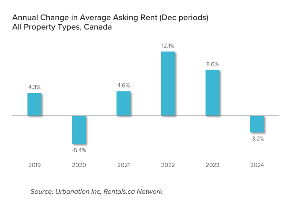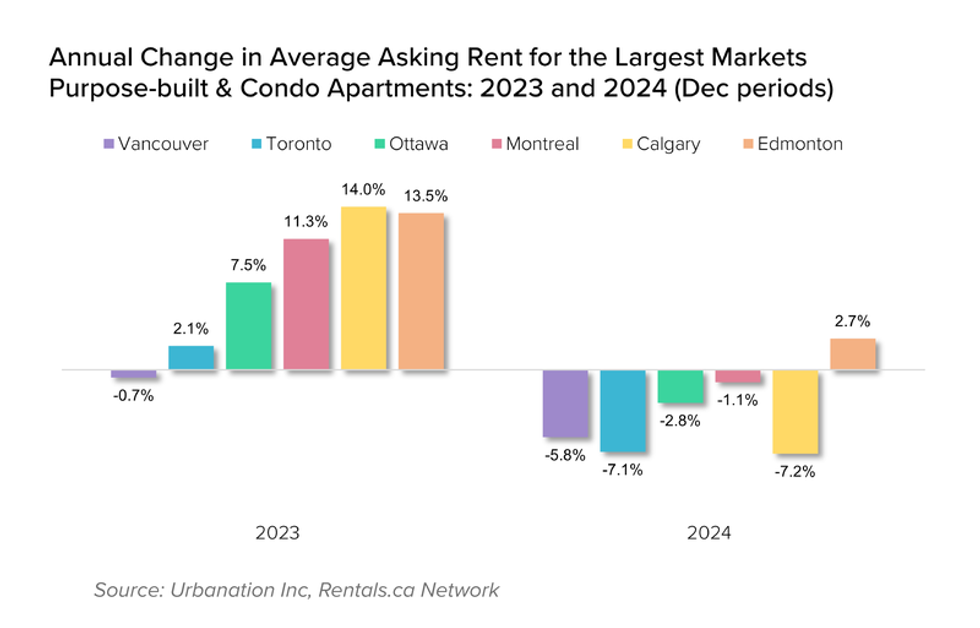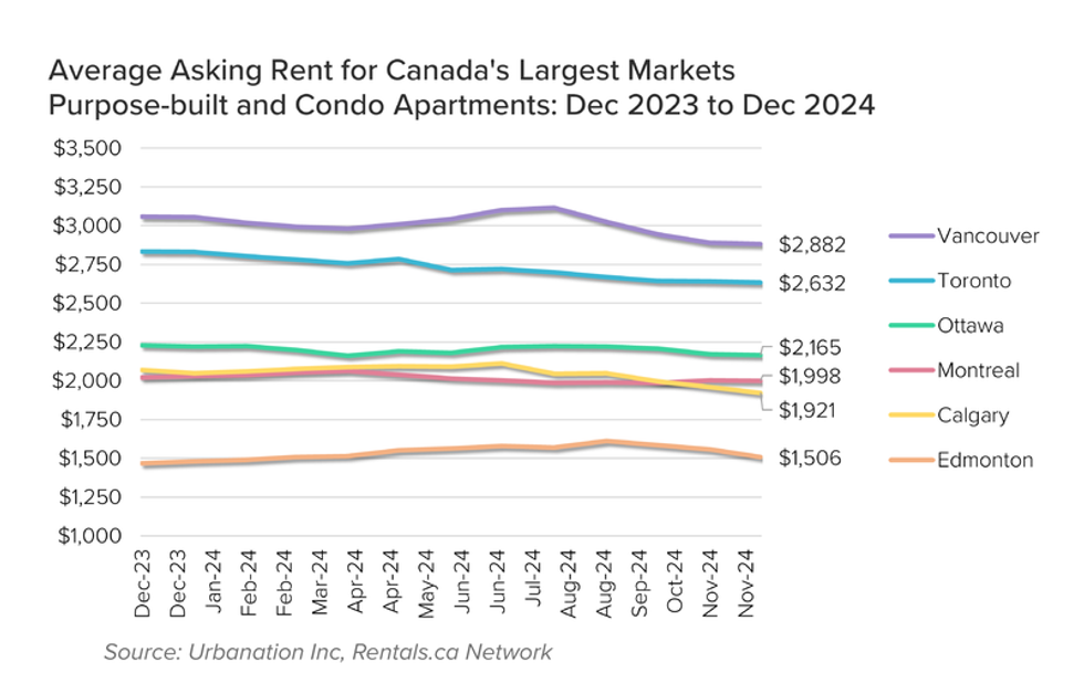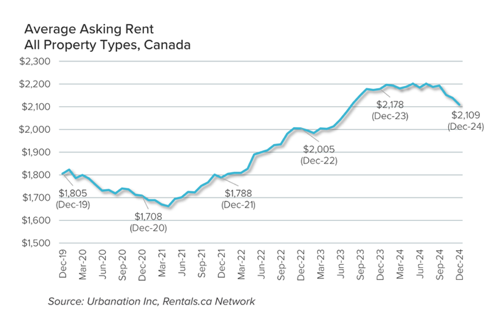 After a historically sluggish year, major Canadian rental markets ended 2024 on a cool note. According to a report released Thursday from Rentals.ca and Urbanation, the average asking rent across all property types was $2,109 in December, representing a year-over-year decline of 3.2% and 17-month low for the metric (on the heels of a 15-month low in November).