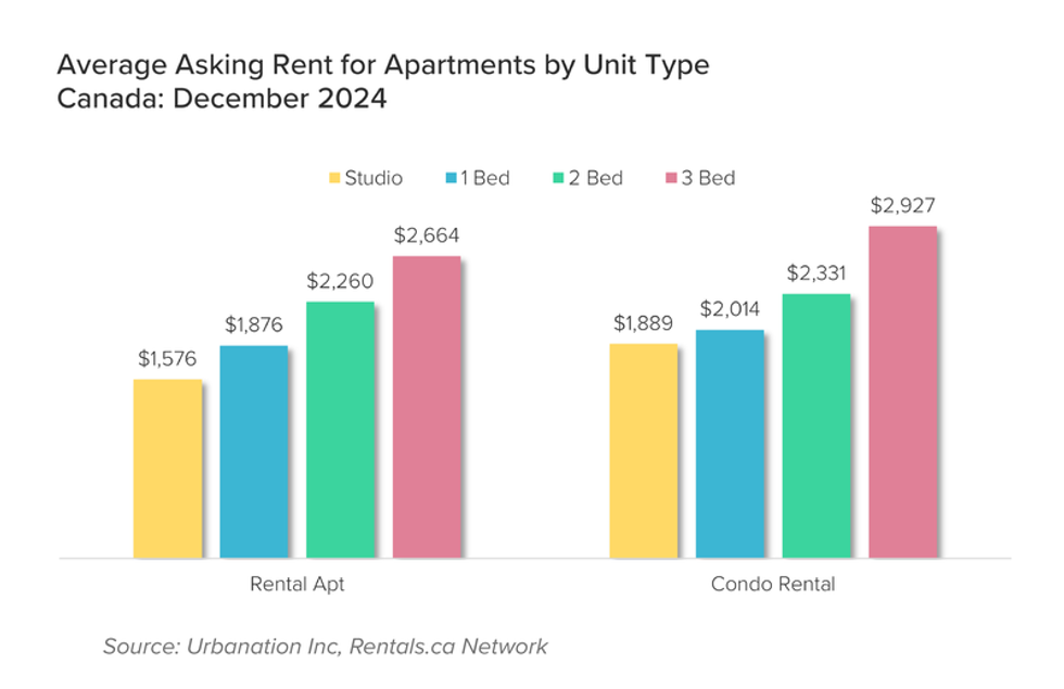 Speaking just to apartments (those within purpose-built rentals and condos) average asking rent came down 1.3% year over year to $2,088. Three-bedroom units outperformed other unit types in terms of year-over-year rent growth in both the purpose-built rental (up 5%) and condo (up 0.7%) segments, perhaps speaking to the need and demand for family-sized rental apartments.