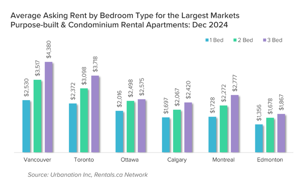 Three-bedroom units in major Canadian markets saw rent decreases (almost) across the board in 2024, falling 3.3% to $3,718 in Toronto, 0.1% to $4,380 in Vancouver, and 8.2% to $2,420 in Calgary. The one exception to that trend was Montreal, where rents for three-bedrooms saw an annual increase of 8.2%.