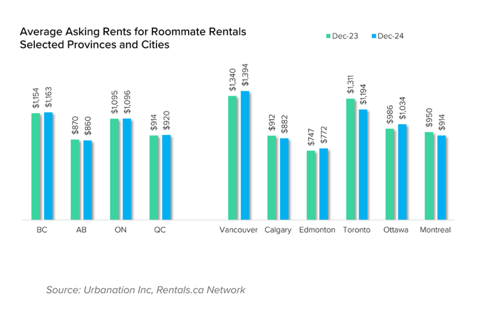 The national average was pulled down by Toronto, where rents slipped 9% (year over year) to $1,194, as well as Montreal (down 3.8% to $914) and Calgary (down 3.3% to $882). Vancouver observed the largest annual increase for shared accommodations, at 4%, bringing the average asking up to $1,394.
