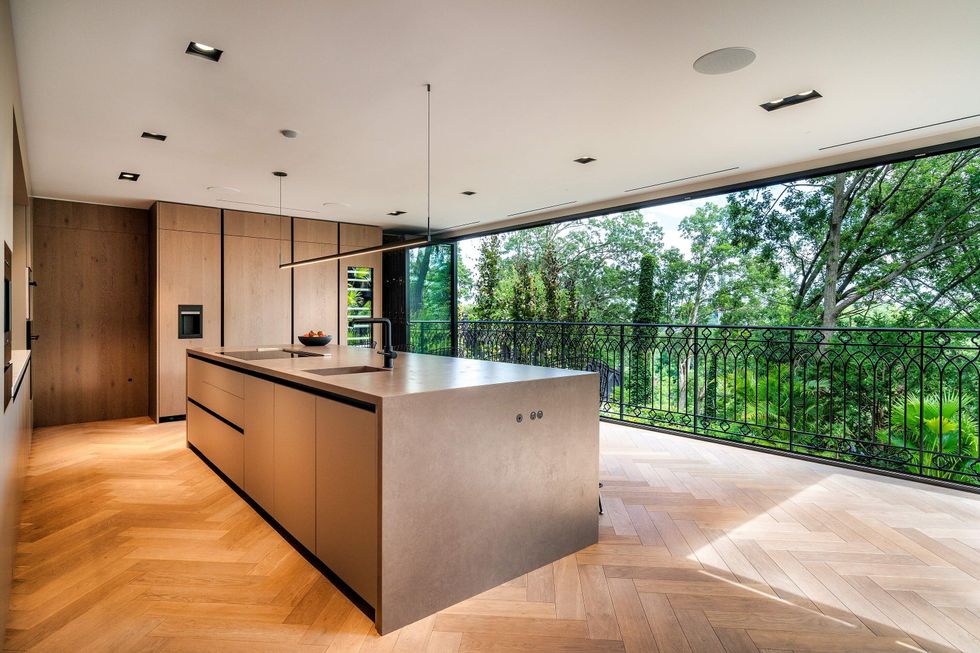 In fact, many rooms on the first and second floors enjoy expansive views and easy access to the home's impressive backyard (more on that later). The kitchen, which overlooks the backyard and ravine from a wrought iron balcony, is a modernist masterpiece designed by Scavolini. Featuring built-in Wolf and Gaggenau appliances, and radiant-heated herringbone oak floors, it's a glorious place to connect and indulge.