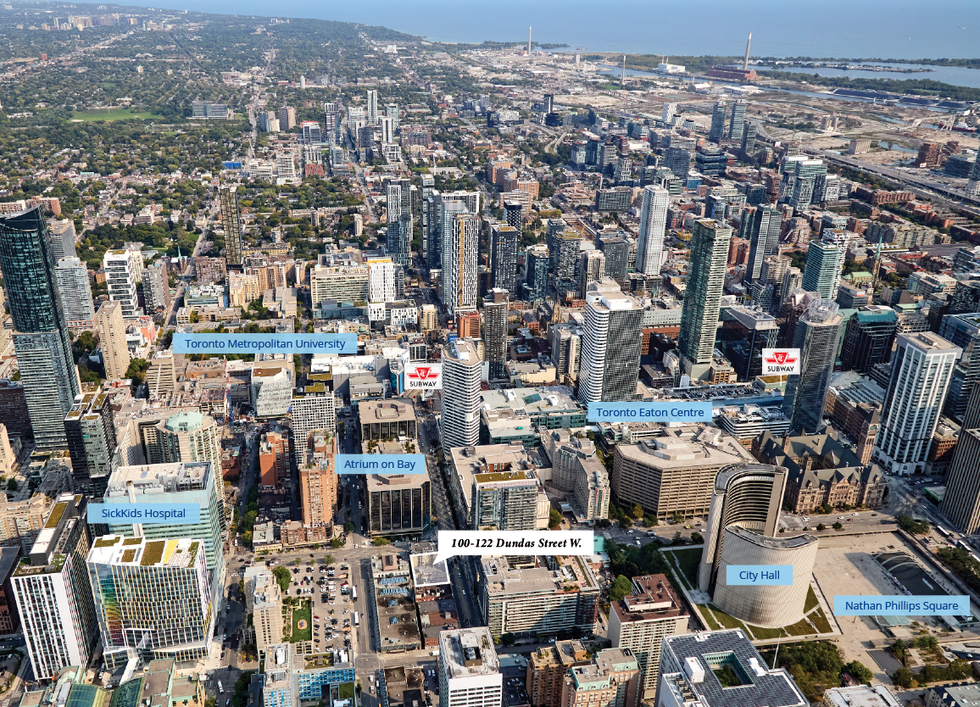 The site is in the company of not only a plethora of urban amenities, dining, and retail options, but also some of Toronto's greatest landmarks, including the Eaton Centre, City Hall, the Art Gallery of Ontario, Hospital Row, and Toronto Metropolitan University.