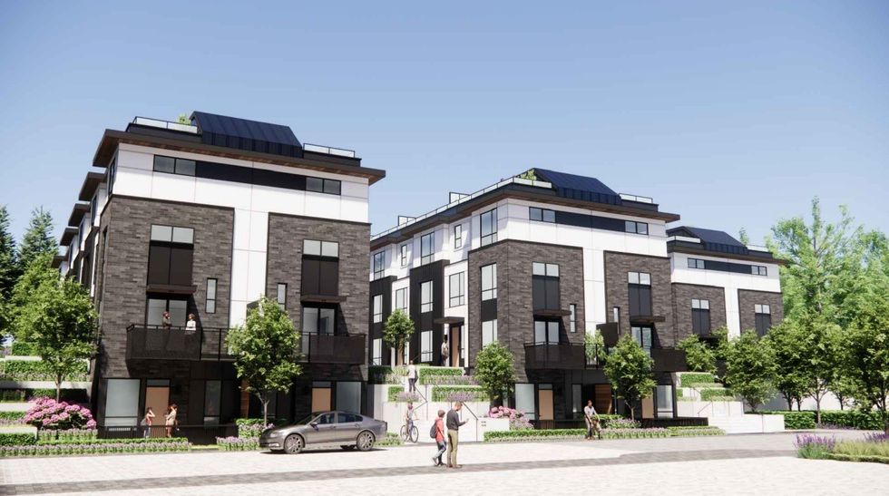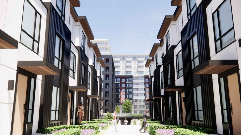 For the site, Beedie is now proposing a multi-phased development with 1,112 total units across three 12-storey strata buildings, two six-storey non-market rental buildings, and a collection of townhouses, as well as some ground-level commercial space along Winston Street.