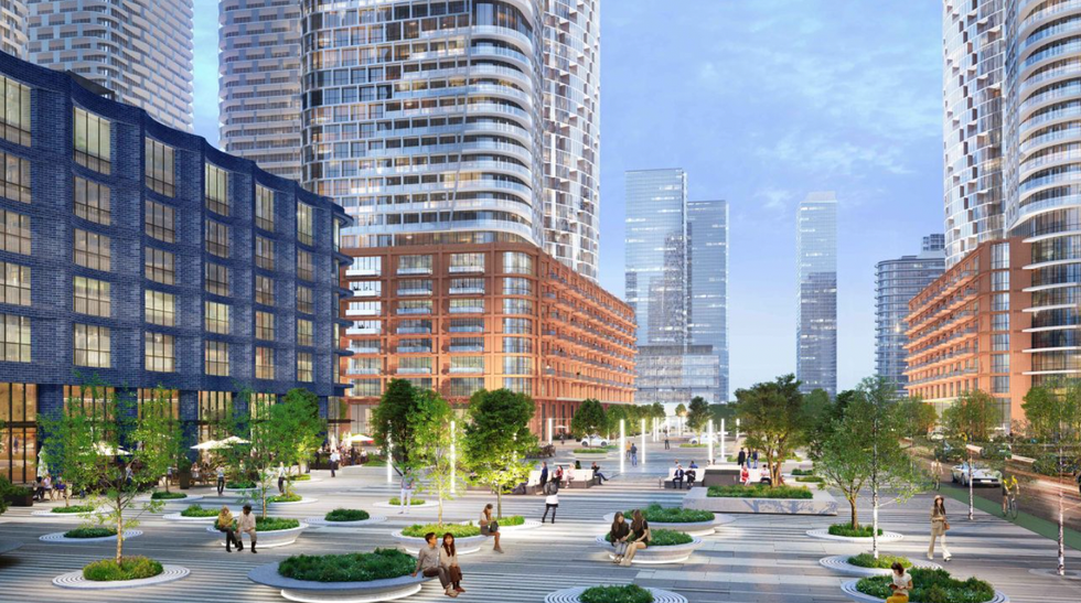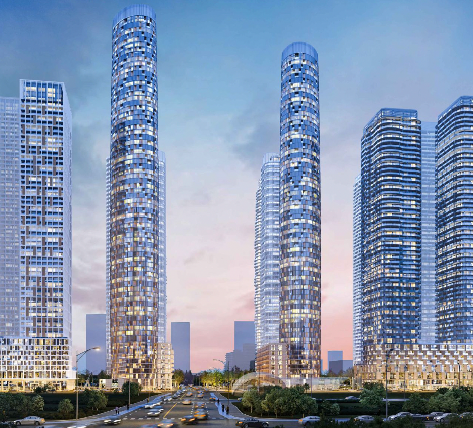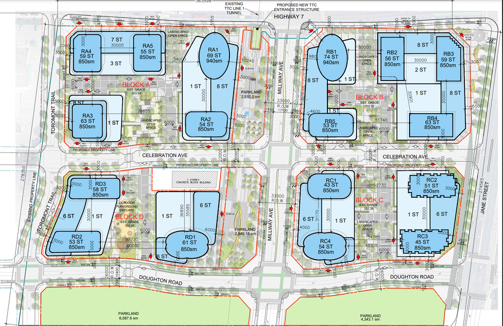The plans, conceived by Toromont Industries Ltd., include four mixed-use development blocks, four public parkland blocks, and the extension of two existing roads and creation of two new ones. All in all, the buildings would include 74-, 69-, 63-, 63-, 61-, 59-, 59-, 58-, 56-, 55-, 54-, 54-, 53-, 53-, 51-, 45-, and 43-storey towers.