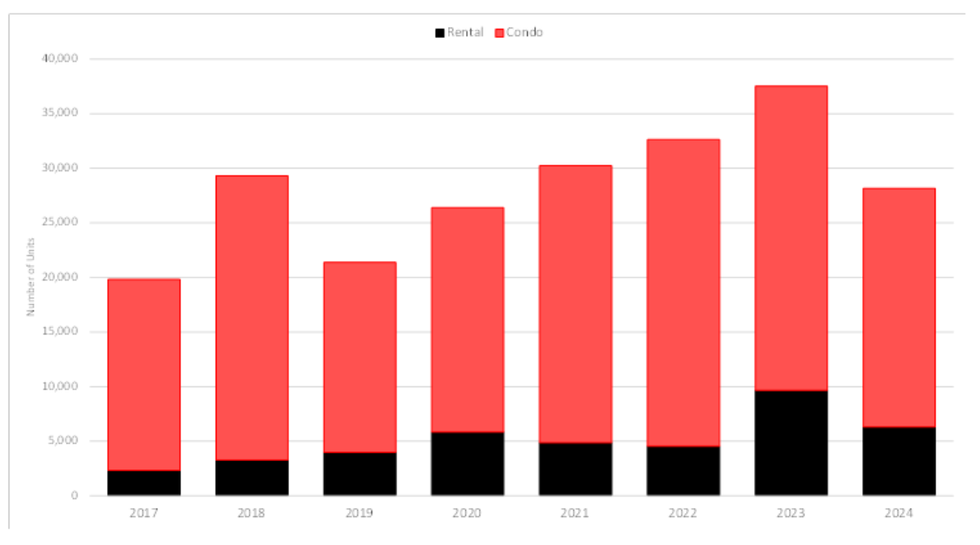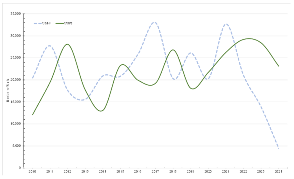 The condo market in Toronto was utterly brutal in 2024 with less than 5,000 sales, and purpose-built rental dropped off a cliff at the same time. As we move into 2025, housing starts are plummeting and the outlook looks bleak.