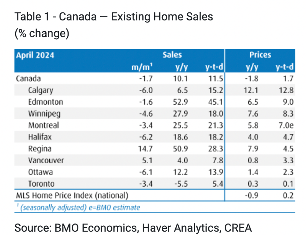 Yesterday, the latest statistics from the Canadian Real Estate Association (CREA) revealed that Canadian home sales actually dipped between March and April 2024, with the number of sales recorded through MLS decreasing by 1.7%. Though sales were up 10.1% on an annual basis. CREA’s Home Price Index was unchanged for April and was down 0.9% annually, while the national average selling price was down 1.8% on the year. As Porter highlights, the dip in home sales occurred despite new listings rising a “sturdy” 2.8%.