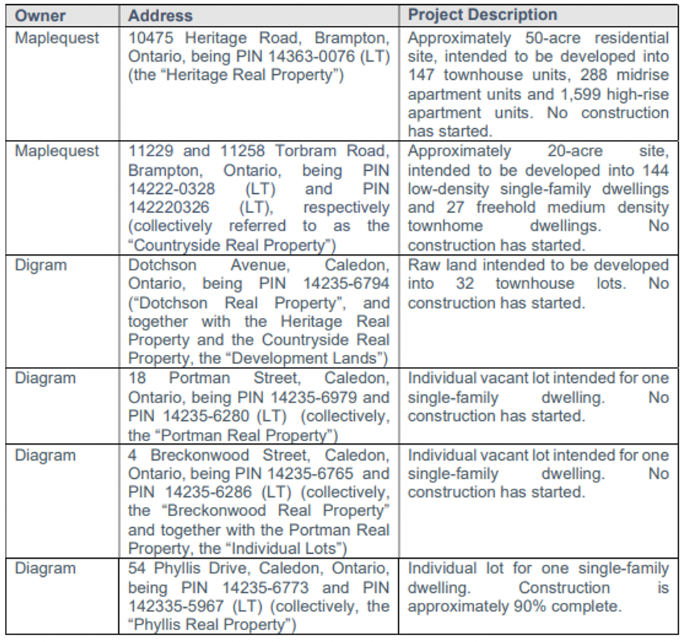 The Digram-owned sites include lands at 4 Breckonwood Street, 18 Portman Street, and 54 Phyllis Drive, as well as the aforementioned parcel on Dotchson Avenue (all in Caledon).