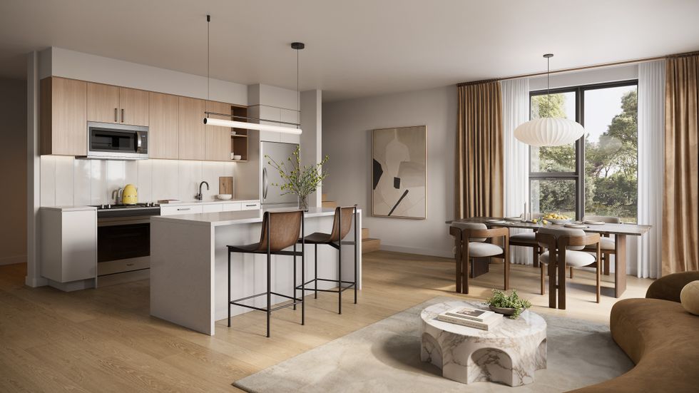 And it doesn't hurt that the townhomes themselves are well-designed. They've got nine-ft ceilings, wide plank seven-inch laminate flooring, private outdoor spaces, and sleek designs. Plus, there's a community park on site.