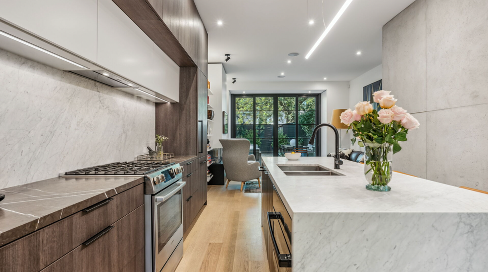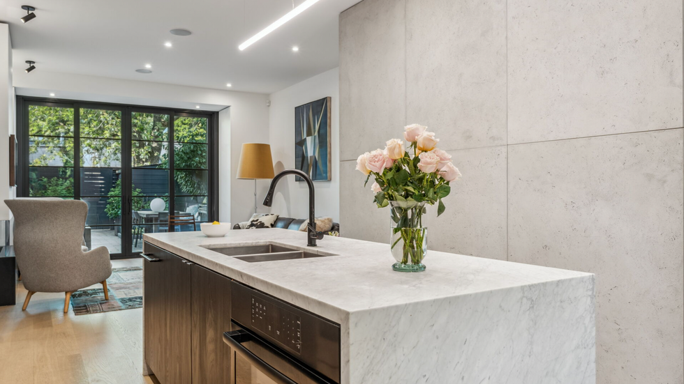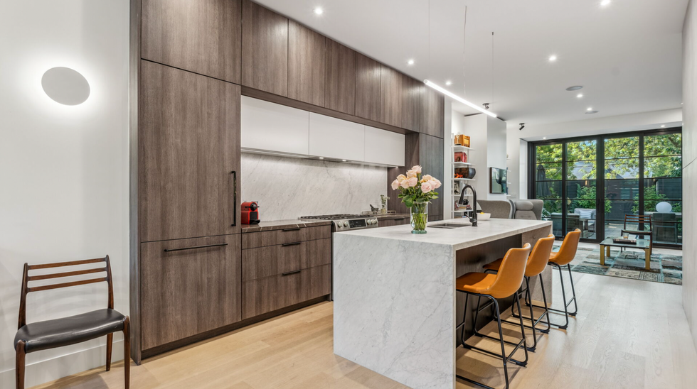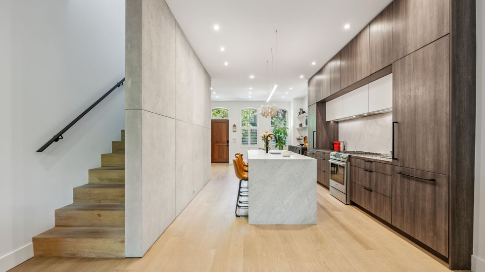 Inside, residents are greeted by an open concept kitchen, dining, and living room which continues to the rear of the home, allowing light to stream in through the backyard. The kitchen has a concrete tile accent wall and the entire space is filled with stylish design flares including contemporary light fixtures, floor to ceiling wood cabinetry, and a marble island with a matching backsplash.