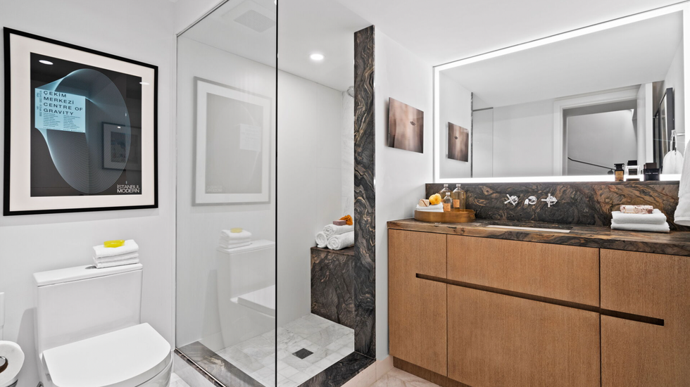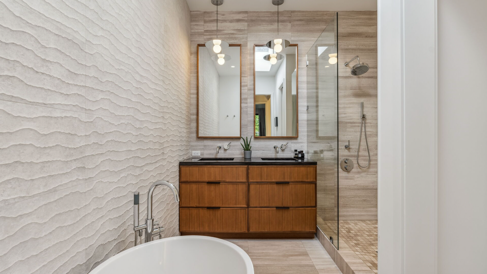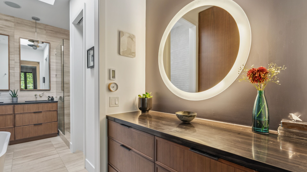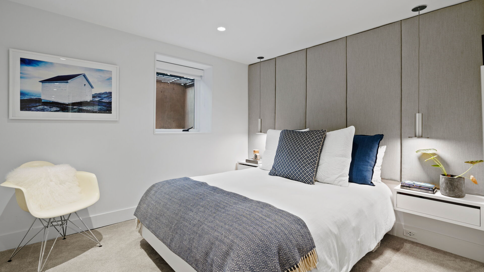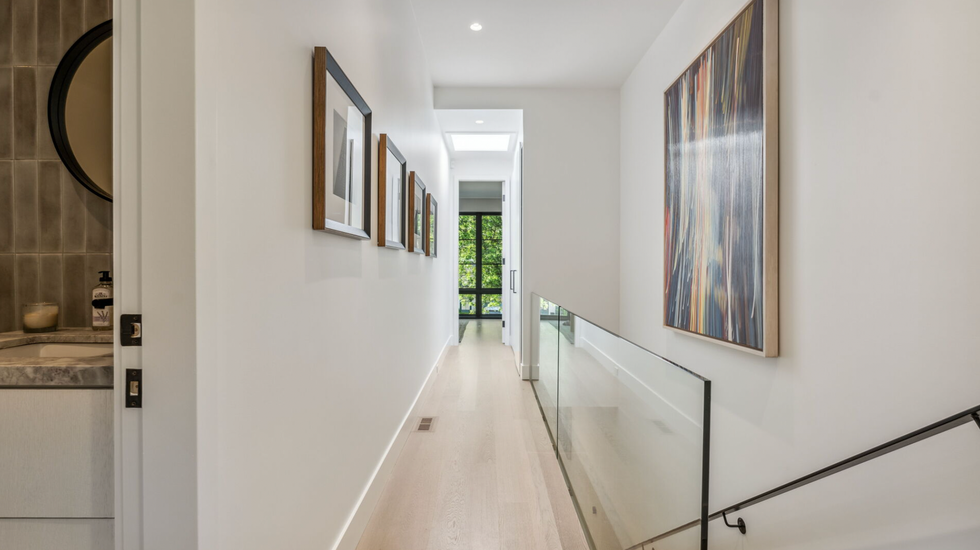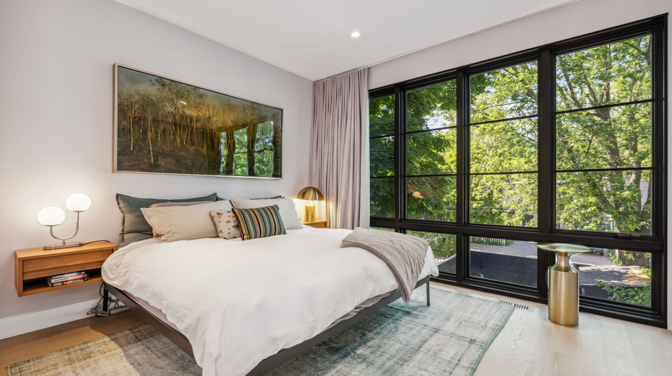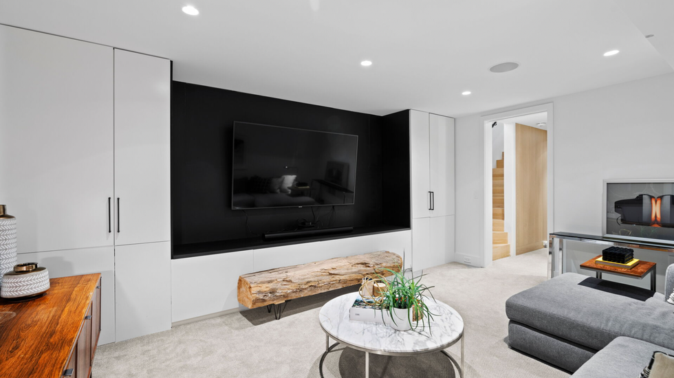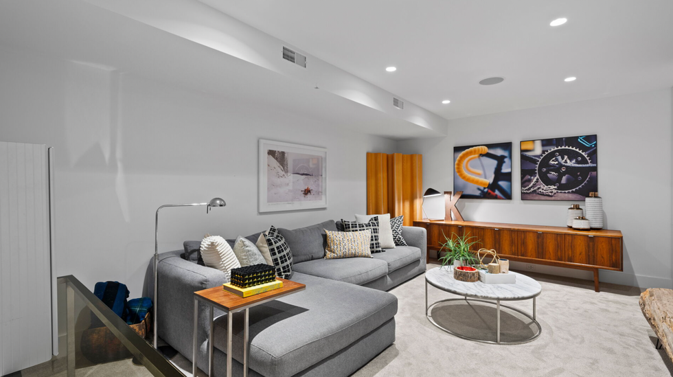 Upstairs, residents can retire to a cozy primary suite with a wall of windows and an ensuite with groovy wall designs. Or, retreat to the sleek lower level entertainment room for family movie night.
