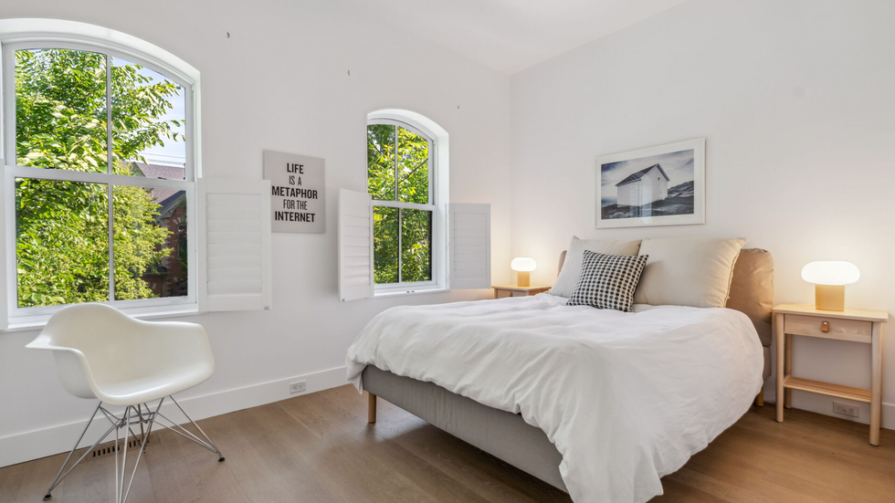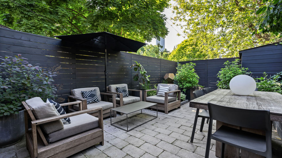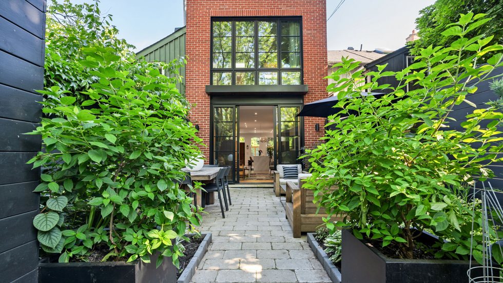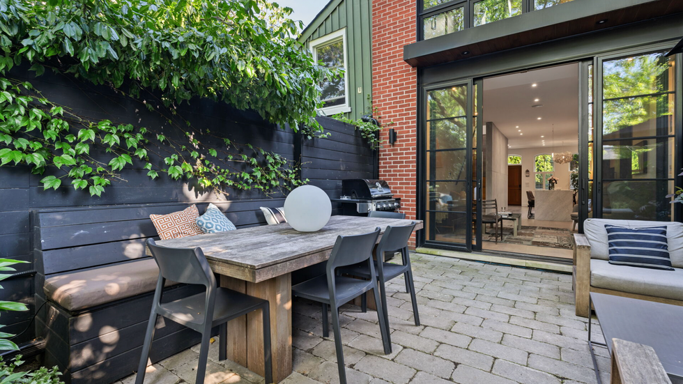 Just off the living room is a charming backyard perfect for entertaining or relaxing, with its multiple seating areas and privacy fence on all sides. Plus, take in the view of stunning factory-style, two-storey windows that climb the homes back facade.