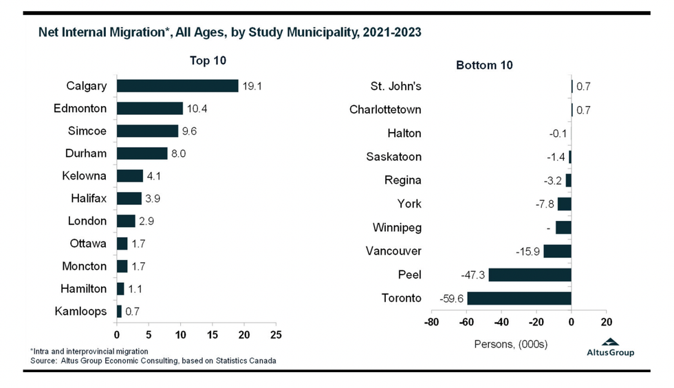 The study's key finding is that in most of the cities with low benchmark rankings, homes are less affordable, homeownership rates decline alongside rental vacancy rates, and outmigration rises. It's no surprise, then, that Toronto saw the largest outmigration, alongside Peel and Vancouver, on record since 2001. Meanwhile, young people aged 25 to 44 are increasingly leaving these same cities to move to the more affordable locales of Calgary, Durham, and Edmonton.