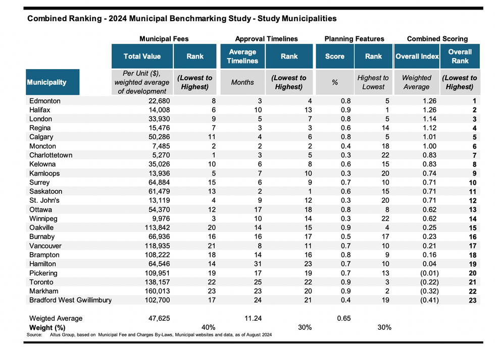 Metrics like development charges and application timelines, combined with availability of planning features like zoning by-laws in an interactive map and status indicators for applications, were analysed and ranked to formulate a benchmark ranking for each municipality. The study found that the top five ranked municipalities were Edmonton, followed by Halifax, London, Regina, and Calgary. At the bottom: Bradford West Gwillimbury, followed by Markham, Toronto, Pickering, and Hamilton.