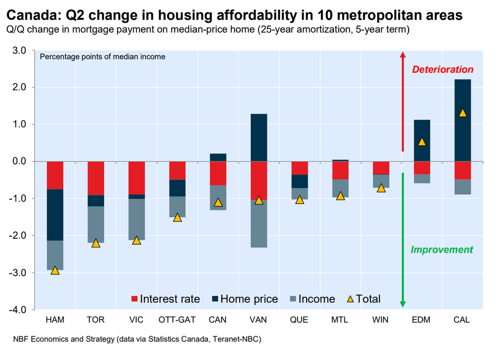 Of course, from market to market, the declines were of varying degrees, the report says. “On a sliding scale of markets from best progression to least: Hamilton, Toronto, Victoria, Ottawa-Gatineau, Vancouver, Quebec, Montreal, Winnipeg.” Conversely, housing affordability “deteriorated” in Calgary and Edmonton.