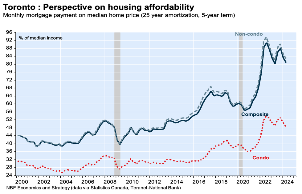 Greater Toronto saw the second-best improvement in housing affordability behind Hamilton, with MPPI dipping 2.2 percentage points to 80.7%. Though that is the lowest the metric has been since the second quarter of 2023, it remains well above the historical average of 52.9% for the city. For condo and non-condo, MPPI was 48.5% and 82.8%, respectively.