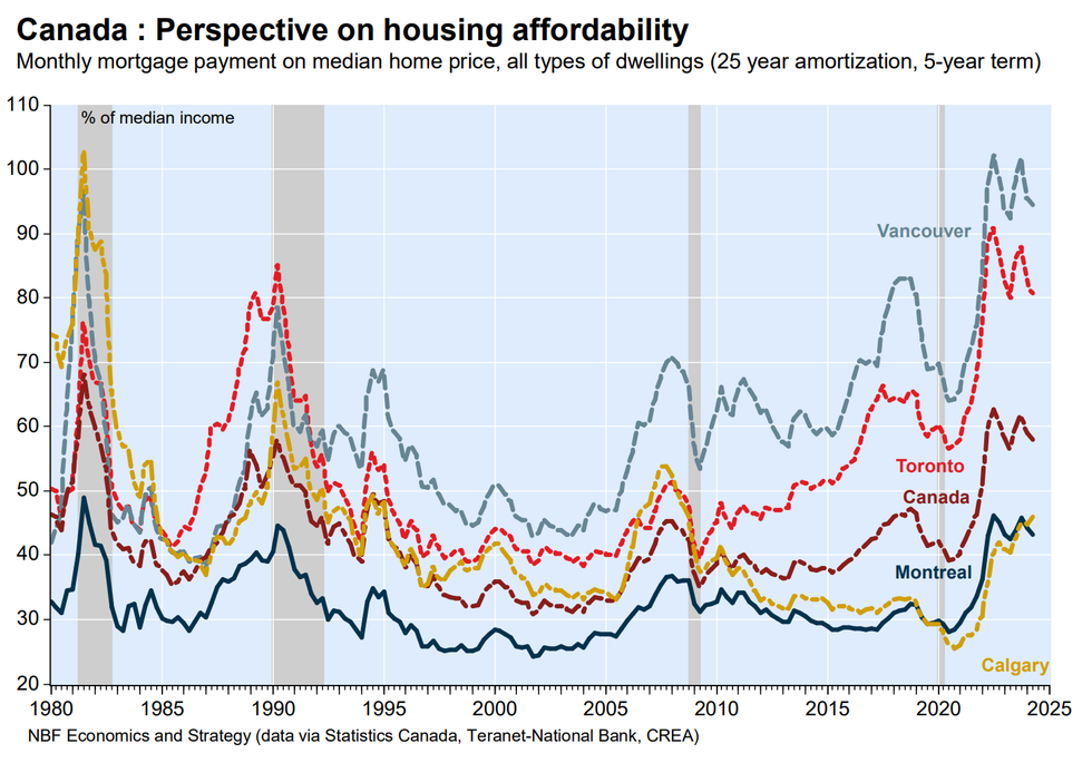 While there are some particulars to National Bank’s methodology to note — for instance, the benchmark mortgage rate assumes a five-year term and 25-year amortization, while income needed to purchase the median property assumes that a household devotes 32% of its pre-tax income for a mortgage payment at the posted rate — the headline takeaway is that housing affordability is on the mend.