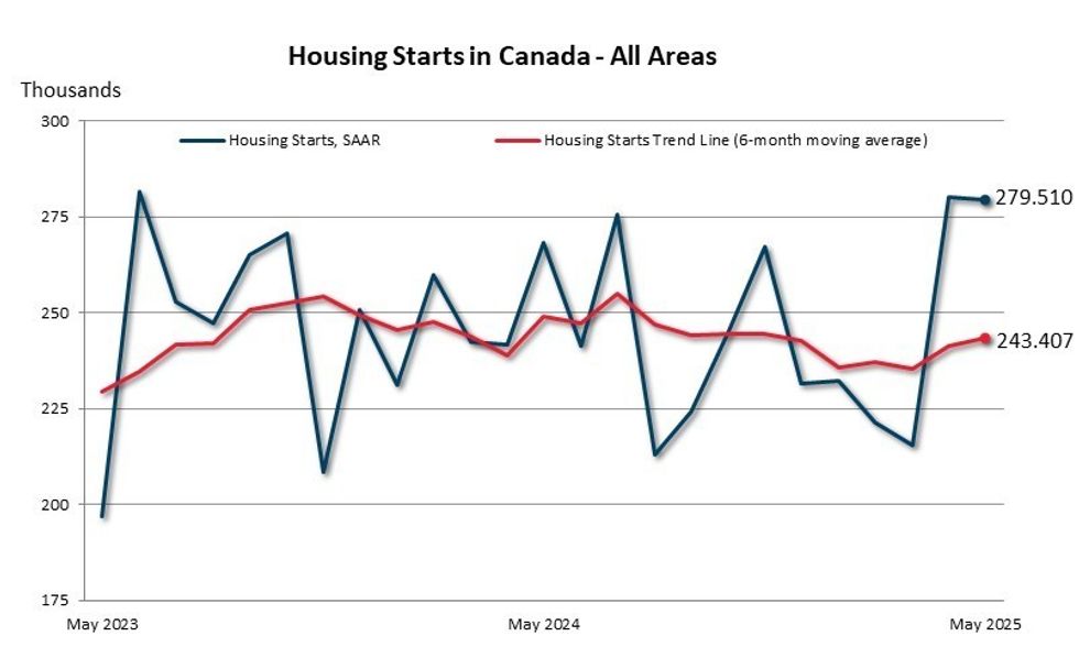 The data comes from the Canada Mortgage and Housing Corporation's (CMHC) latest housing starts report, and shows that May was a more subdued month compared to April when not only the SAAR of housing starts surged, but actual housing starts were up 17% year over year — the "highest actual housing starts for the month of April on record," according to CMHC.