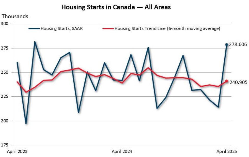 While April brought a welcomed change of tune with housing starts hitting a historic high, CMHC highlighted that starts in some of Canada's largest and most expensive markets are still falling short while tariffs continue to take their toll.