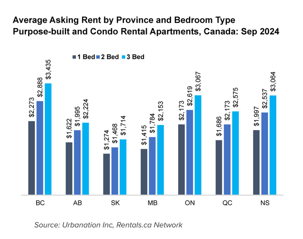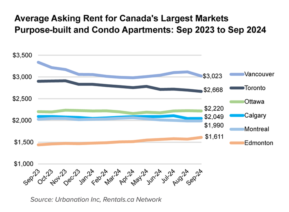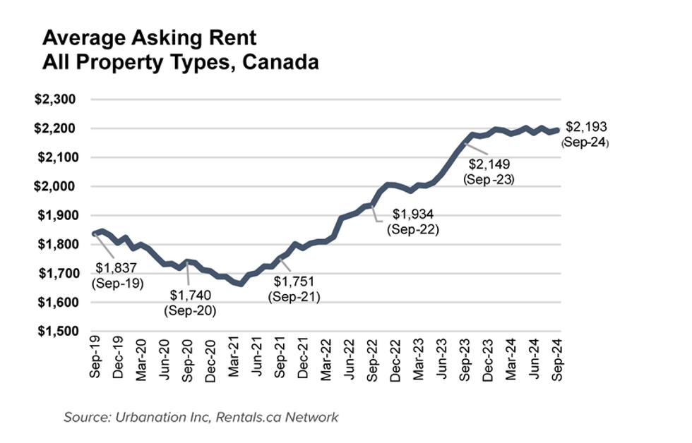 The report, released Wednesday, shows that asking rents across all residential property types in Canada came in at $2,193 in September, and that figure marks a rise of just 2.1% year over year. In August, that same metric clocked in at 3.3%.