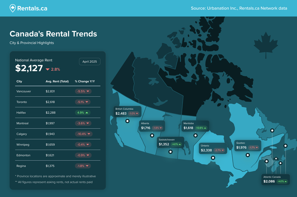 Purpose-built three-bedroom apartments experienced the most significant annual rent increase at 4.4%, but all purpose-built unit sizes saw rent growth from March to April. Conversely, condo rents decreased across all unit sizes, with two-bedroom condos showing the largest year-over-year decline of 5.9%, to $2,344.