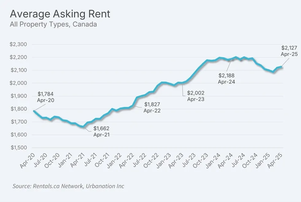 Despite recent softening in some markets, the average asking rent for all residential properties in Canada increased 0.4% in April to $2127, according to the latest National Rent Report from Rentals.ca and Urbanation. This marks a five-month high and the second straight month of gains.