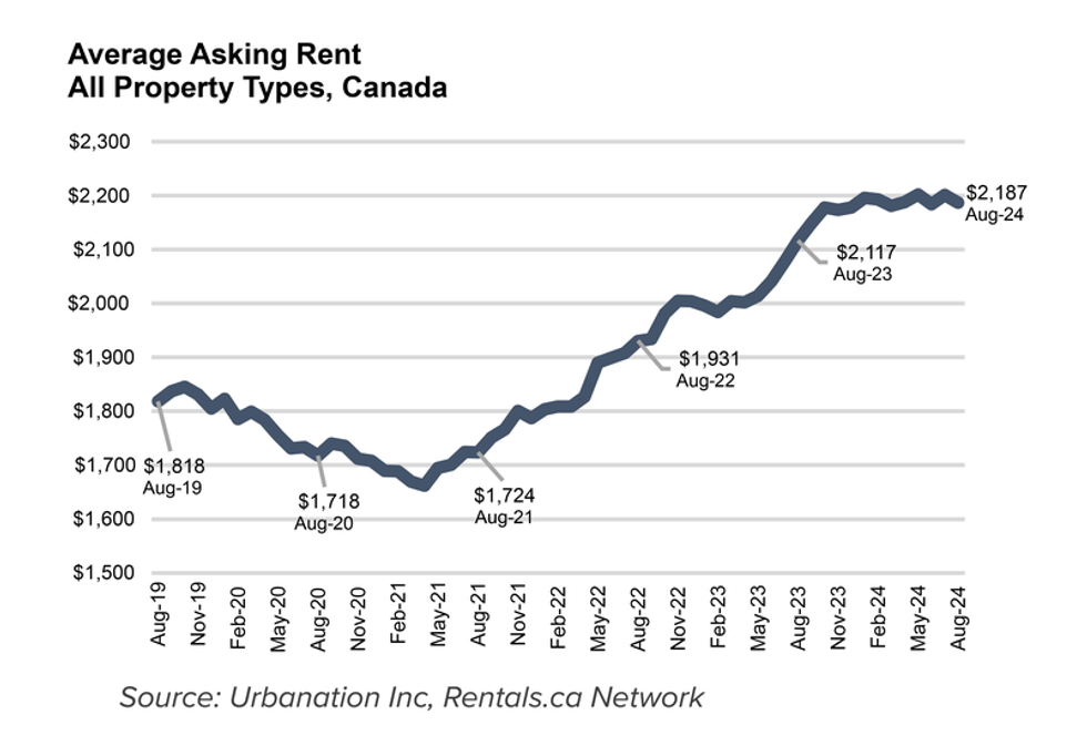 “Since reaching a record high of $2,202 in May 2024, average asking rents in Canada have declined by 0.7%,” the report says. “Outside of the COVID-19 period, it is historically irregular for rents to decline at this time of year.”