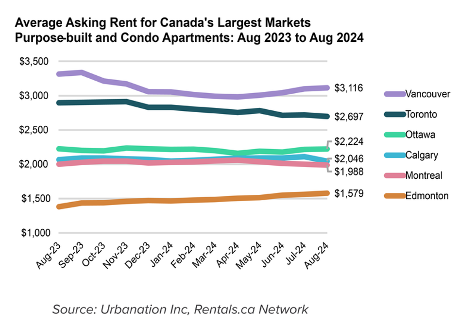Provincially, rents continued to be the highest in BC and Ontario in August — although both provinces observed year-over-year declines.