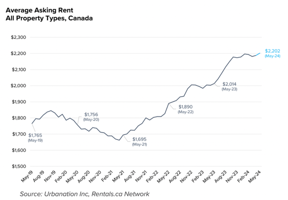 The record break follows last month’s reported all time high of $2,188, with average asking rents for all residential property types in Canada having increased 9.3% year-over-year in May, according to the report.