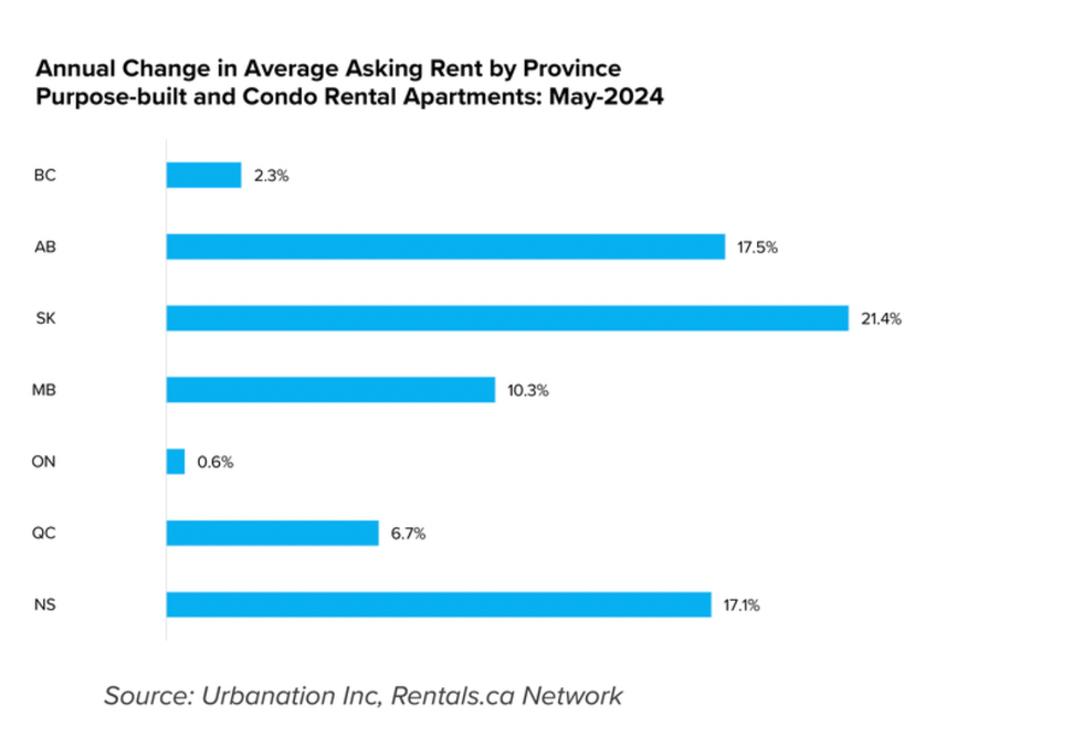 Quebec was the only outlier, recording a "month-over-month decline in apartment rents during May, dipping 0.6% from April to an average of $1,999." However, the report did include that asking rents in Quebec were still up 6.7% from last year.