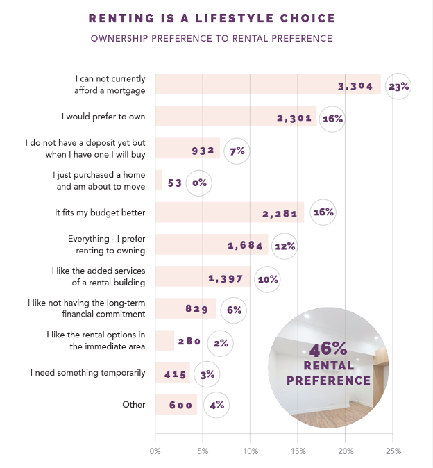 Getting into the specifics of that data: 46% of current renters say that they have a “preference” for rental living. Of that group, 16% say renting fits their budget, 10% say they enjoy the “added services” that come with their rental accommodations, and 6% say they like not having a long-term financial commitment.