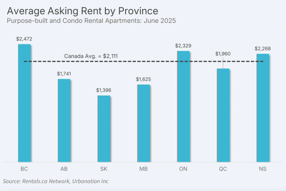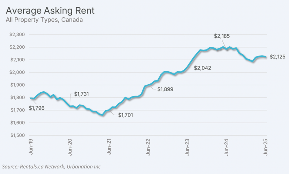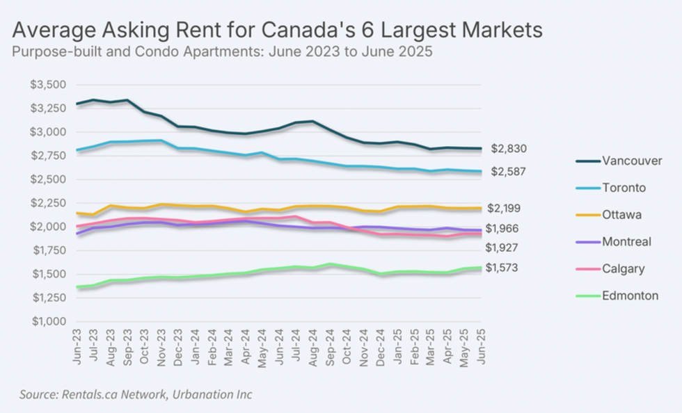 At the national level, rents fell 2.7% year over year to $2,125 in June, according to the latest rent report from Rentals.ca and Urbanation. June marked the ninth month in a row to see annual decline, and the report reveals that sliding rents were driven largely by secondary market units.