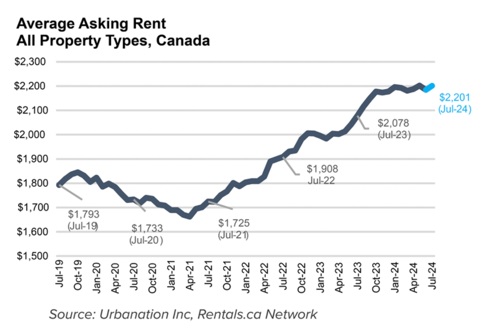According to the July National Rent Report from Rentals.ca and Urbanation, average asking rent across all residential property types hit $2,201 last month — a 5.9% year-over-year increase and the slowest annual growth in the past 31 months.