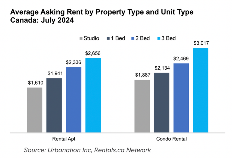 Condo studio rents fell annually by 2.8% to an average of $1,887, though purpose-built rental studios remain the more affordable option despite jumping 13.7% to an average of $1,610. Across all unit types, purpose-built rents experienced the largest annual increases in July, though on average, still remained $203 more affordable than condo units.