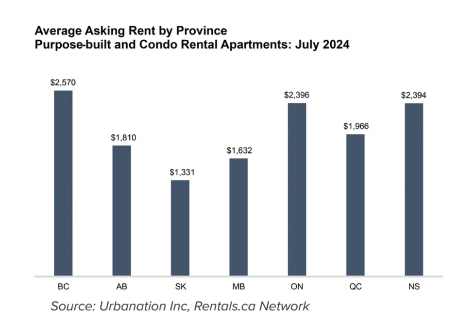 A provincial breakdown in the report reveals that Saskatchewan outstripped all with a 22.2% year-over-year increase in purpose-built and condo apartment asking rents. Still, this lands the prairie province’s average asking rent at $1,331 — down $8 from June and 38% below the national average of $2,156. Of the rest of the provinces, Ontario and BC were the only ones that saw annual decreases in rent, with BC down 2% to an average of $2,570, and Ontario down 1.5% to an average of $2,396.