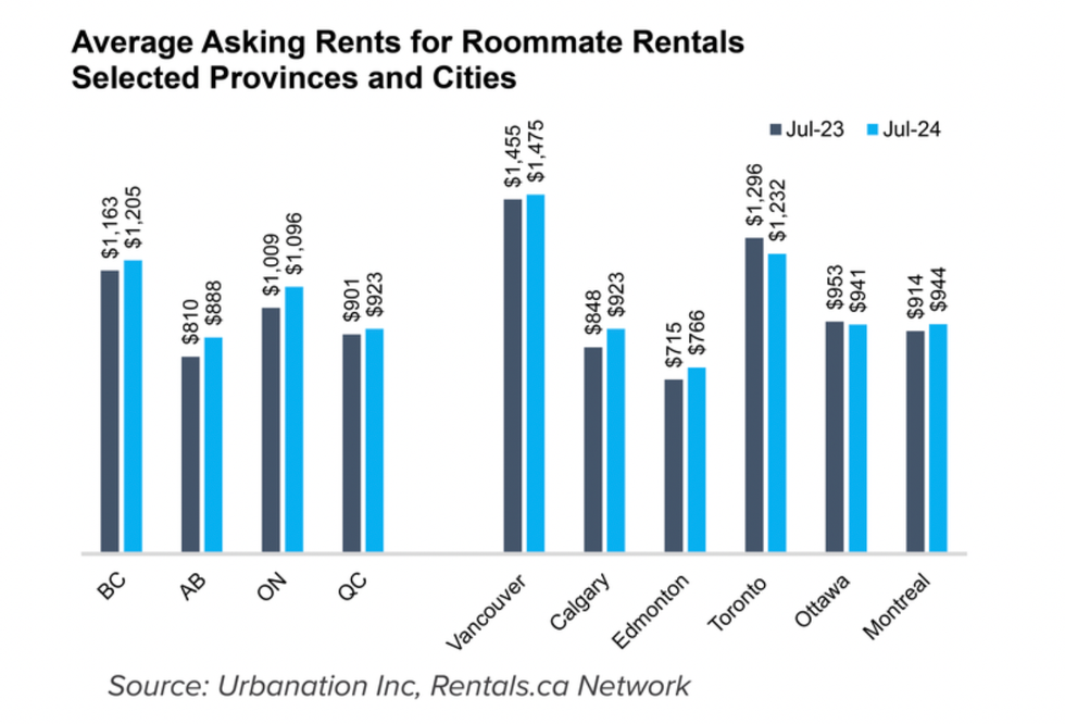 Finally, average asking rent for shared accommodations jumped by 9.1% year over year across BC, Alberta, Ontario, and Quebec, hitting its highest average rent in the past five months at $1,005. In Toronto, roommate rents dropped 0.3% monthly and 4.9% annually to $1,232, while Calgary saw a 8.9% annual increase to $923. Vancouver continues to hold first place for most expensive roommate rents among major cities at $1,476, up 1.4% annually.