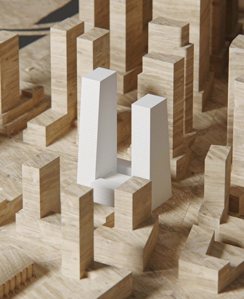 Renderings from Cobe architects show “The Smokestacks” as sleek, asymmetrical slanted towers that are described in the official plan as “architecturally distinct.”