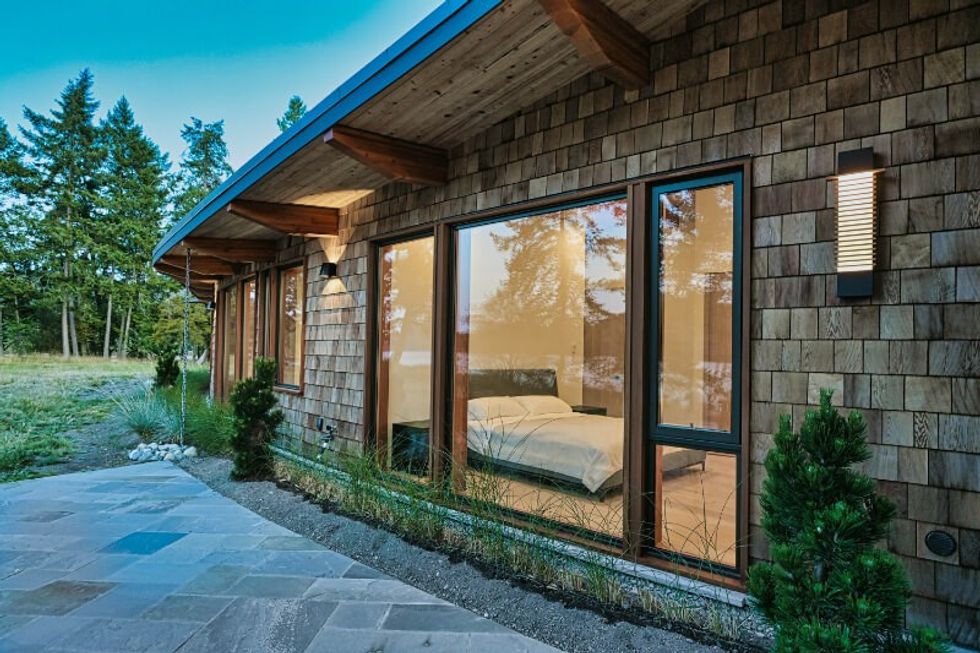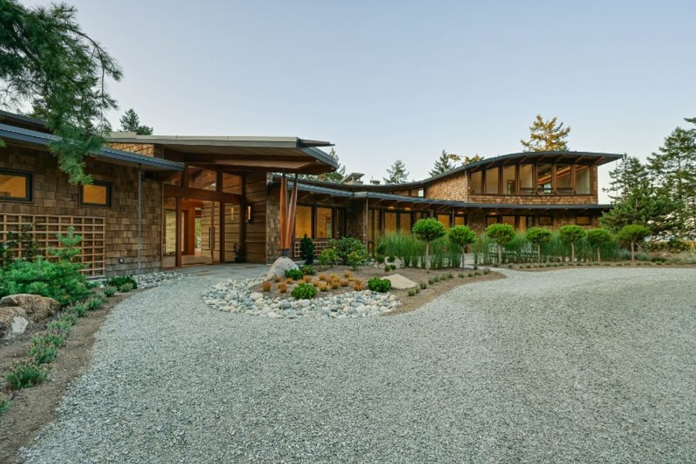 The home is found at a vantage point that juts into the Salish Sea, accessed by a narrow road on the west side of the property that extends through a mature forest filled with fir, arbutus, and maple trees.