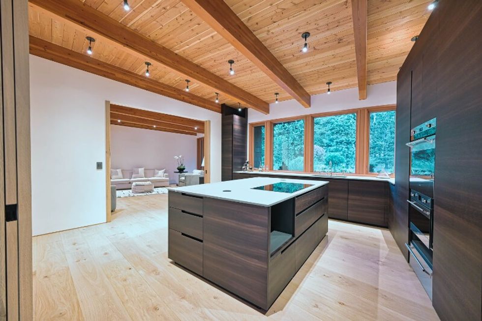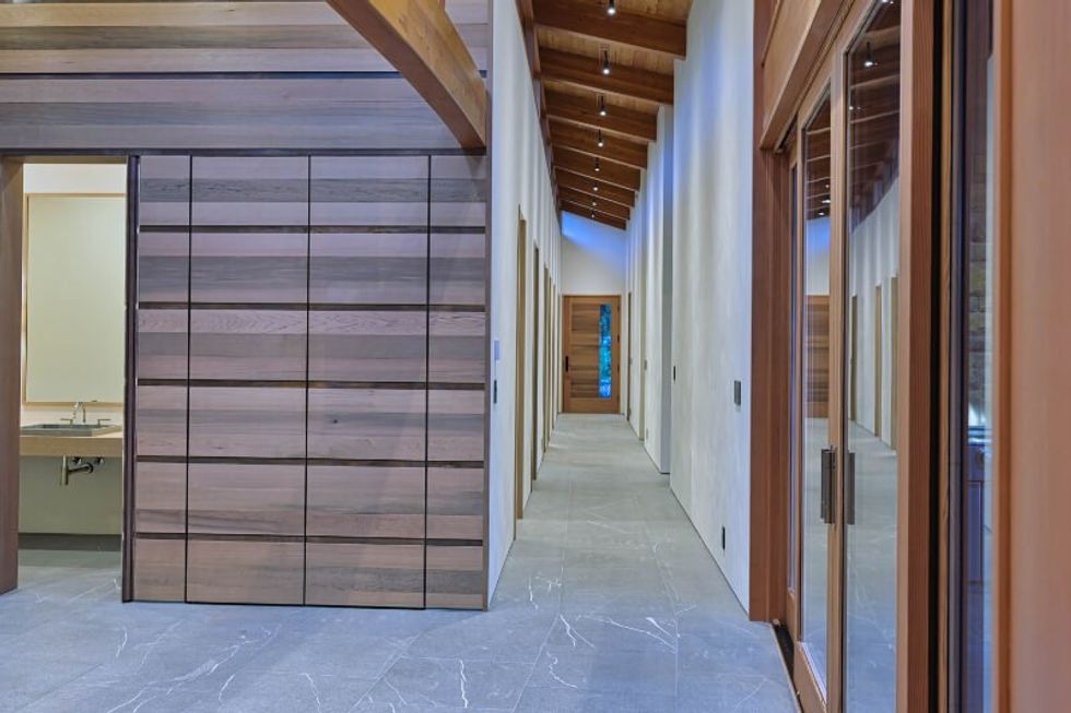 The home is shaped like a long, curved rectangle, with all of the living space located in the main floor, save for a 538 sq. ft office on the upper level. All interior floors are finished with wide-plank European white oak and Pietra Piasentina stone tiles, all doors are made of the same white oak, and all walls are finished with lime paint that creates a suede-like illusion.