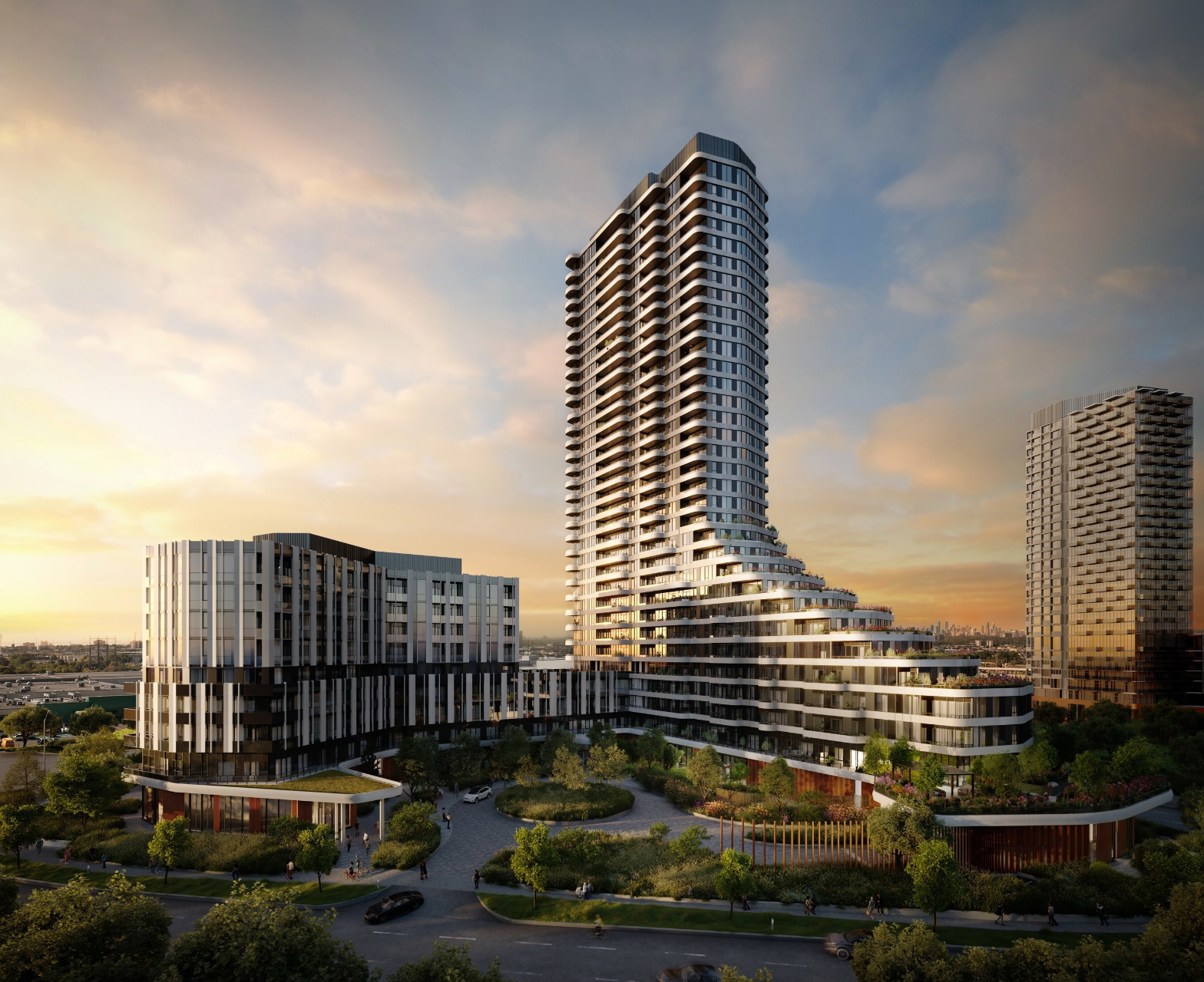 The renderings, supplied by the architectural firm also behind the larger Cloverdale master plan, Giannone Petricone Associates, reveal the striking final design for the 33- and nine-storey development planned for the eastern edge of the property and slated to launch for sale this fall.