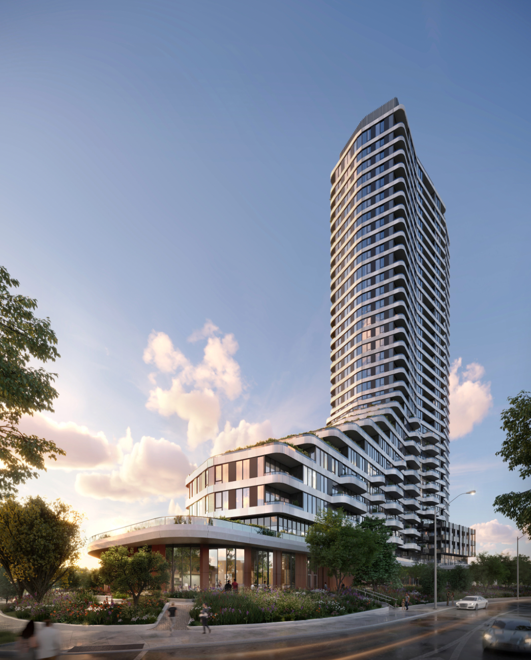 Located on the northwest corner of Dundas Street West and The East Mall Crescent, the two-building development dubbed 'The Clove,' will feature a 33-storey mixed-use condominium that shares a base with an adjoining nine-storey mid-rise, containing a total of 606 new condo units. The development would also be home to over 350 sq. m of retail space and 2,424 sq. m of amenity space.