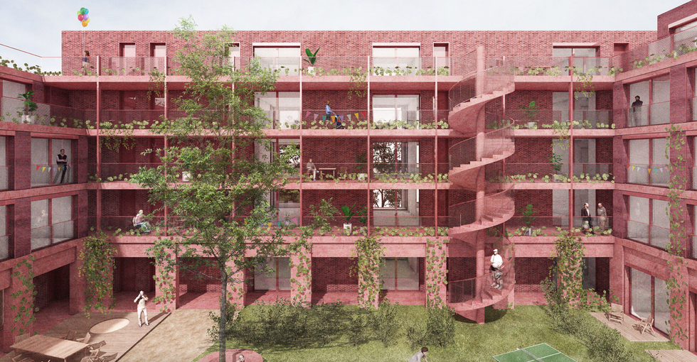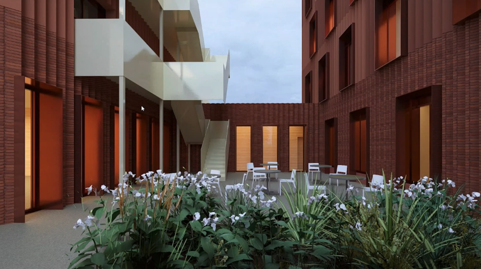 Like the other four proposals, the Danforth Avenue build will be constructed using pre-fabricated modular mass timber and red brick, materials Keesmaat says give the building a homey feeling.