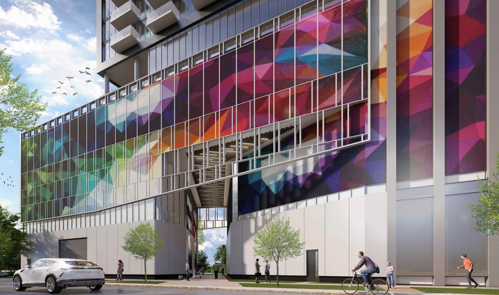 Designs from Graziani + Corazza Architects further differentiate the building with fun, angular forms and a colourful art piece that define's the building's facade.